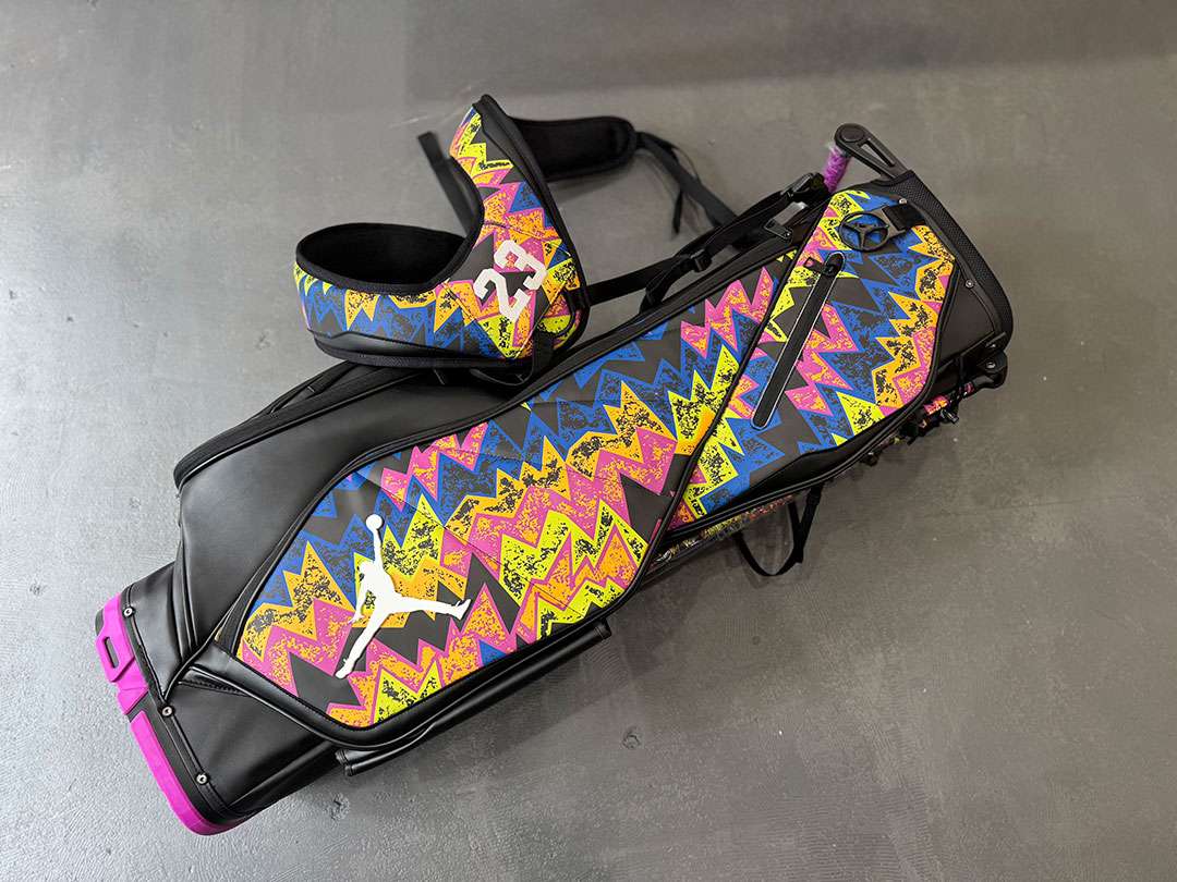 歴代ジョーダンシューズに用いられたデザインを各所にちりばめたジョーダンゴルフバッグ プレミアム。
