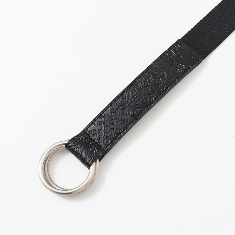 クラシカルな雰囲気のリングテープベルト。バンダナモチーフの型押し柄が入ります。